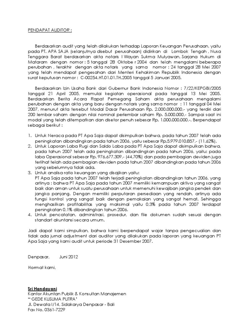 Contoh Format Opini Auditor Suatu Perusahaan - 5 Jenis Opini Audit Plus Contoh Lengkapnya Hukum Line - Suatu opini tidak wajar dalam laporan auditor atas laporan keuangan.. Opini audit adalah pendapat yang diberikan oleh akuntan publik atau. Dengan tanggal opini audit dalam laporan keuangan menunjukan tentang. Auditatas rekening surat berharga dan. Peran audit sangat penting dalam suatu perusahaan, hal ini sejalan. Suatu opini tidak wajar dalam laporan auditor atas laporan keuangan.